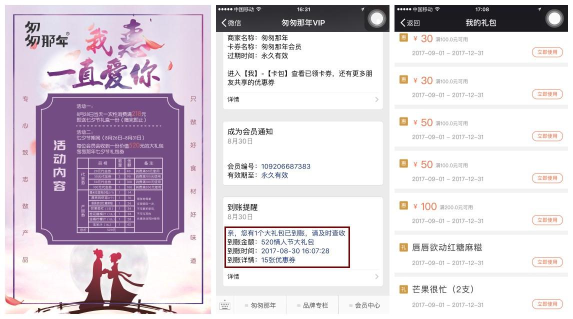 据了解,借力微盟智慧餐厅,“匆匆那年”创建了自己的微信O2O平台,以支付和会员为核心,有效实现顾客的沉淀和转化;同时,微信公众号定期推送各类优惠券作为“注册开卡礼”,在顾客用餐“优惠支付”场景下快速实现转化。据统计,“匆匆那年”每月被成功转化的线下顾客比例高达70%,建立了完整的微信会员营销系统,通过大数据跟踪记录新老会员的成长值,将会员消费价值最大化挖掘。在营销活动上,“匆匆那年”利用微盟智慧餐厅系统后台40多种营销插件,定期开展主题活动,对不同等级的会员进行精准营销,唤醒沉睡会员。七夕节期间,“匆匆那年”在微信上发起“我惠一直爱你”券包赠送活动,共计发放13855份券包,核销率高达35%。更值得一提的是,“匆匆那年”借力微盟智慧餐厅发布的业内首个微信小程序与公众号打通的餐饮解决方案,撕开线上流量红利,通过“会员、权益、数据”的互通形成“线上+线下”营销闭环,实现了短期内10万新会员的成功转化。