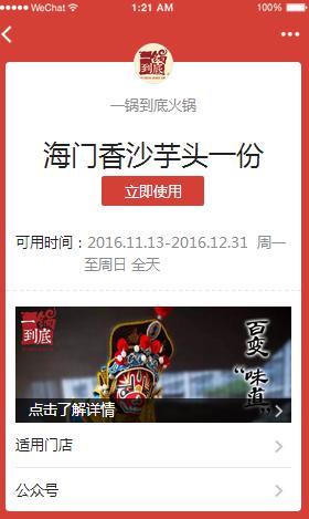 在广告创意上,一锅到底以文案“煮一锅红艳,品百味人生”配合图片四川经典的变脸形象烹制火锅,重庆火锅红油翻滚的场景跃然眼前,让吃货们浮想联翩。用户点击“领取优惠”,可直接跳转到卡券领取页面,免费获得一份海门香沙芋头的福利,凭核销码到店消费。卡券页面嵌入规则介绍和适用门店,促进用户到店。