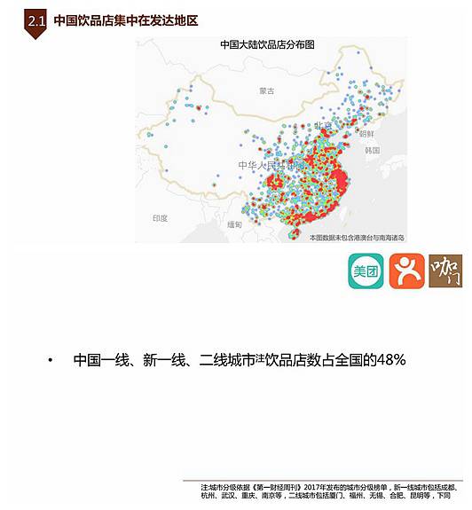 整个中国饮品市场,饮品店主要集中在中部城市、东部沿海城市。