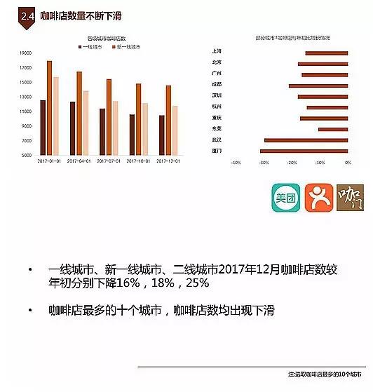 1)咖啡馆在新一线城市发展的速度最快,但2017年整体数量仍呈下滑趋势;