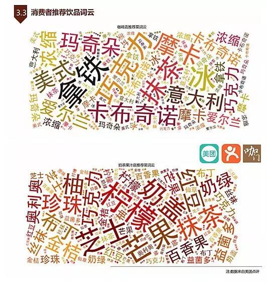 1)咖啡店推荐菜词云中,拿铁、摩卡、卡布奇诺等经典款依旧备受宠爱;