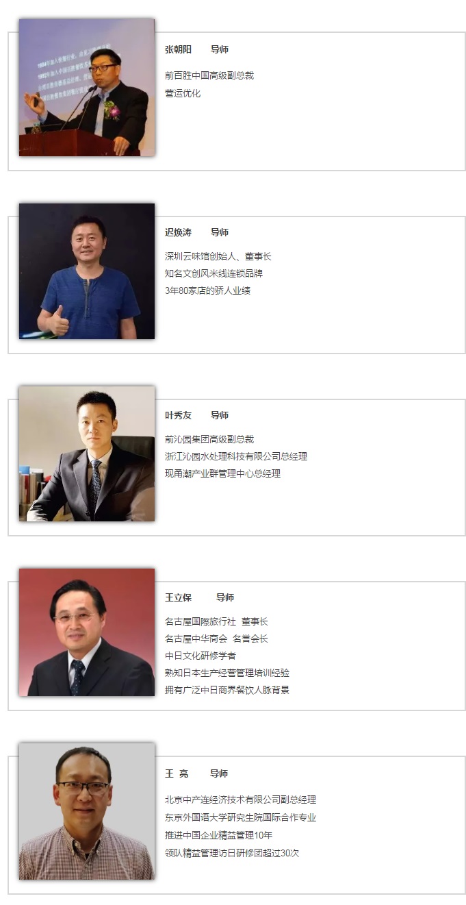 【日本中产连】全称【中部产业连盟】日本国经济产业省直属的官方效率技术专业机构,是日本历史最久规模最大的工业生产管理技术研究、指导和普及的专业集团之一。拥有广泛产业资源,是日本最大的产业联盟。《日本经营管理标准(JMS)》的制定者,因此本项目具有深厚的日本产业界背景,除中高层管理人员外,有机会邀请到多位行业巨擘、知名餐饮或供应链企业的董事长现场论道交流,更有机会走到企业的生产车间、中央厨房、门店后厨等实地考察学习。