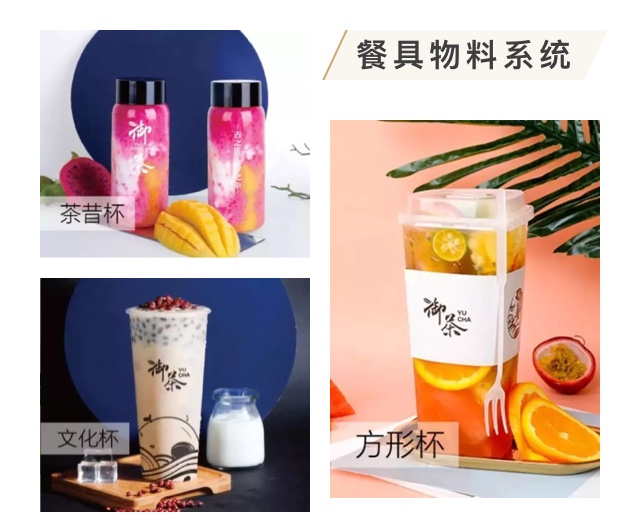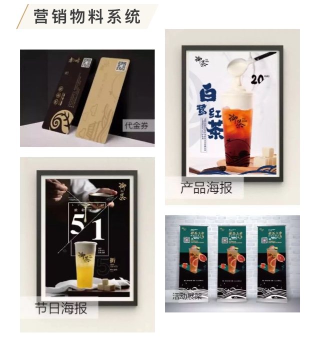 御茶的视觉形象系统非常齐全且实用,从产品的餐具到装饰门店的海报物料,再到营销用的运营海报物料等等一应俱全,方便快速立店,也能满足品牌长期盈利的需求。