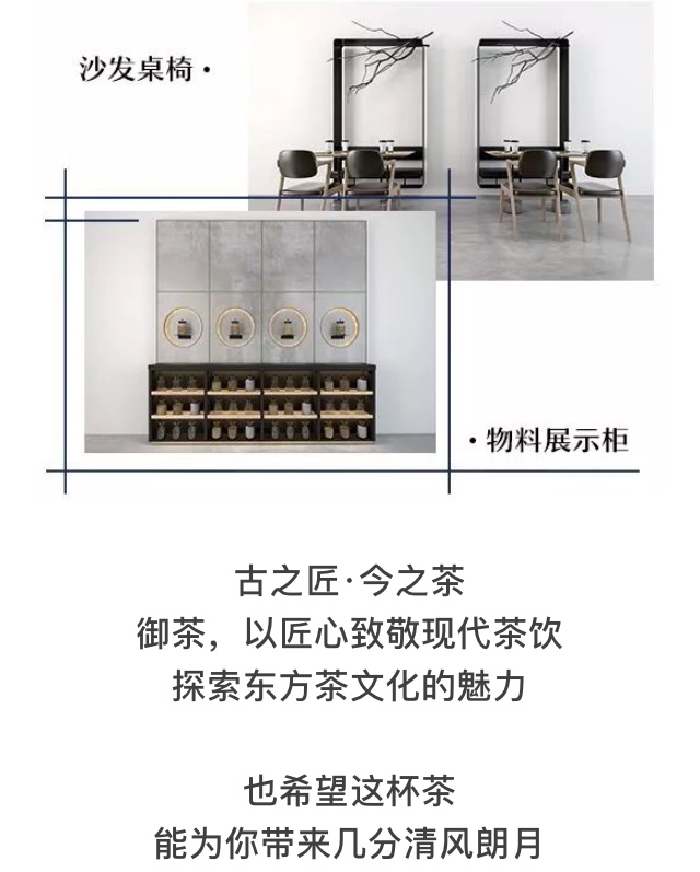 怀着对东方文化的崇敬与热爱,创始人将『天圆地方、天人合一』融入御茶的门店设计理念中,中国几千年的文化古韵以崭新的姿态融入设计里,尽显端庄、素雅、归真之气。