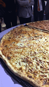 比赛现场最引人注目的,无疑是一个直径一米、含四种口味的巨型披萨,披萨表面铺满了赞助商Arla爱氏晨曦提供的高品质马苏里拉干酪,4公斤的用量让整个披萨乳香四溢,不仅场内观众频频侧目,就连路过的人员也纷纷拍照留念。