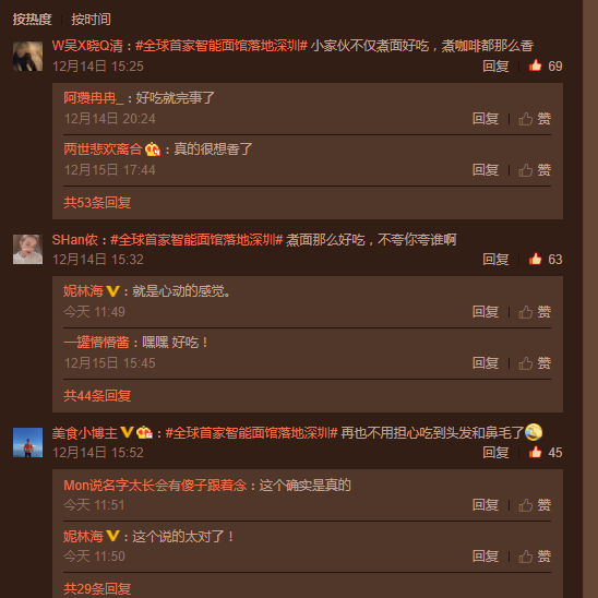 活动中,现场嘉宾饶有兴趣地参观了智能面馆的后厨,对造面怪兽大加赞赏,称一定会带家人来尝一尝机器人造出来的面。深圳电视台财经生活频道、龙岗电视台《众创TV》以及10几位行业自媒体,与嘉宾们共同见证这场盛大的“嘉年华”仪式,并感受了智能面馆超智能的用餐体验。