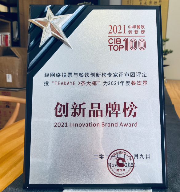 同期,聚焦餐饮创新发展的2021第五届中华餐饮创新榜TOP100榜单也于本届论坛中隆重揭晓。茶大椰凭借加盟连锁品牌模式与品类创新入围中华餐饮创新品牌榜榜单,并在众多知名企业当中突围,成功斩获2021第五届中华餐饮创新榜TOP100“创新品牌奖”,实至名归!