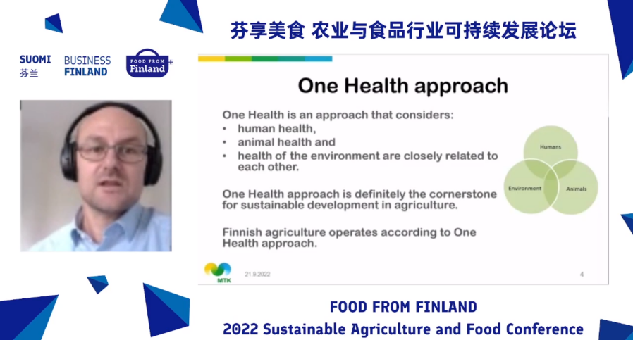 芬兰中央农林主联合会国际贸易总监Thimjos Ninios先生聚焦于上游生态介绍:“减少碳排放、增加碳固定、增加可再生能源的使用以及适应气候变化。为此,芬兰农业按照‘同一个健康’方法运作。此方法考虑到了人类健康、动物健康和环境健康。毫无疑问,‘同一个健康’方法是农业可持续发展的基石。”