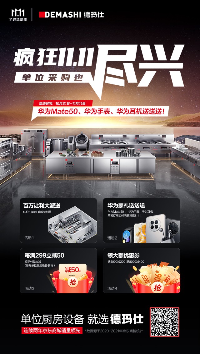 据了解,上京东,搜德玛仕,双11活动多重优惠持续进行中,10月31日-11月11日期间,单位厨房整套采购更加划算!除此之外,单笔订单实付满额就送华为产品,还有部分产品也将参加京东官方活动,每满299立减50,以及大额的优惠券可领取的活动。年底单位厨房一站焕新,在德玛仕就能轻松实现。