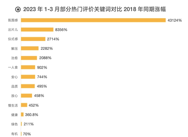 从美团和大众点评APP的消费者消费后的评价关键词来看,2023年1-3月份期间,“氛围感”、“出片儿”的评价关键词对比2018年飞速上涨。消费者需求的变化也为新消费提供了生长空间。他们不仅仅追求商品“性价比”,更加看重品牌的文化、创意与情感附加值。