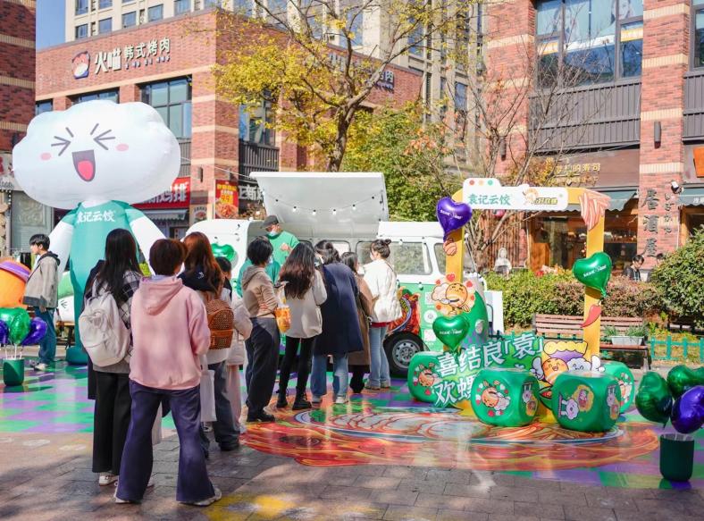 12月8日至12月10日,在杭州市下沙宝龙商场的户外广场,餐车快闪活动正在进行中。在现场,大家不仅可以和4米高的“显眼包”袁宝气模玩偶合影打卡,还可以免费试吃联名新品“螺蛳粉汤全家福饺子/云吞”“炫”到饱,参加现场CP活动,更有超多人气联名周边疯抢不停!活动现场首日,众多粉丝和美食爱好者闻讯而来,其中还有不少粉丝是从周边城市特意赶来。现场气氛火爆,试吃餐车前连续五小时大排长龙,大家纷纷感叹:“一口鲜美云饺一口灵魂螺蛳汤,完美融合的两广风味碰撞到嘴上,真香!”。