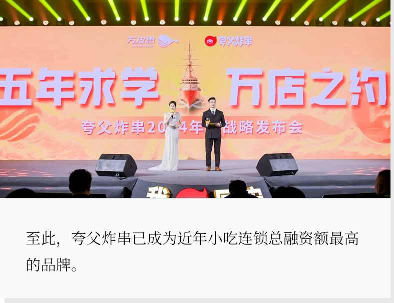 2月26日,夸父炸串宣布完成B轮融资,由愉悦资本、绝了基金联合领投,不二资本和老股东华映资本跟投,蔚澜资本担任独家融资顾问。至此,夸父炸串已完成近5亿元人民币融资,成为近年小吃连锁总融资额最高的品牌。