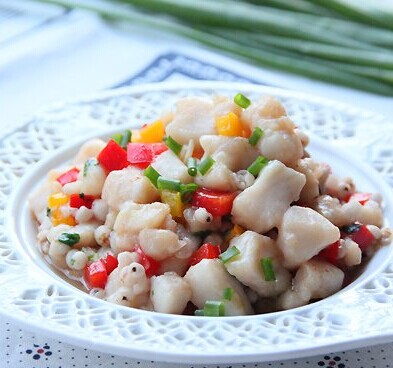 2. 将解冻的龙利鱼切成大小均匀的丁状,放入适量料酒和盐抓匀腌制15分钟左右。薏仁用高压锅焖制10分钟取出。红黄彩椒洗净切块。