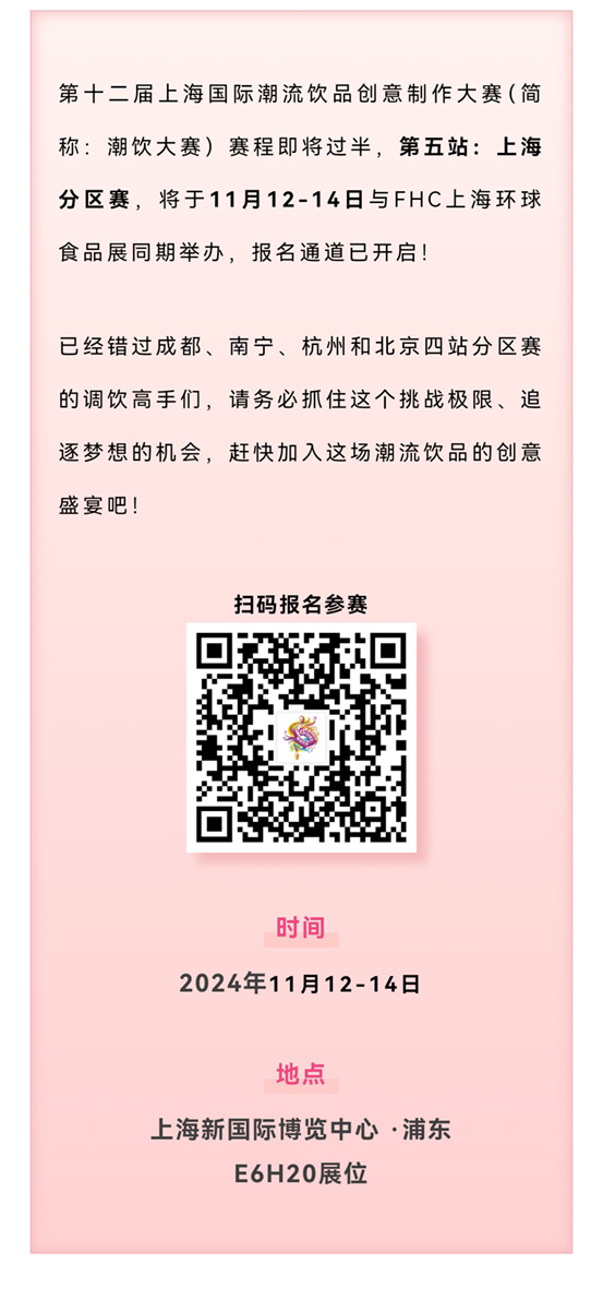 潮饮大赛~赛程即将过半,第五站:上海分区赛,将于11月12-14日与FHC上海环球食品展同期举办,报名通道已开启!