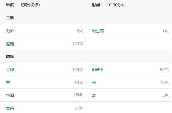 1. 准备食材:对虾剪去须,背部开刀去除黑线,火腿切薄片,嫩豆腐切块,蘑菇切片,胡萝卜削皮切片。
