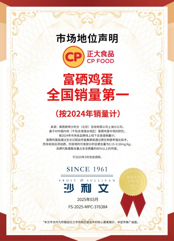在健康消费大潮下,富硒食品正成为越来越多消费者的优选。近日,正大富硒鸡蛋凭借卓越的品质、严格的安全标准和消费者的高度认可,获沙利文认证“2024年度富硒鸡蛋全国销量第一”。这一认证不仅是市场对正大富硒鸡蛋的高度认可,更是健康饮食趋势下消费者信赖的见证。