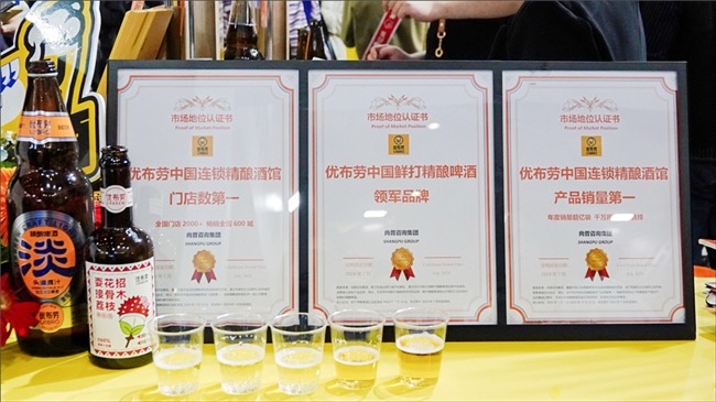 2024年7月,优布劳荣获得了尚普咨询集团颁发的“中国鲜打精酿啤酒领军品牌”、“中国连锁精酿酒馆产品销量第一”,以及“中国连锁精酿酒馆门店数第一”三项称号。