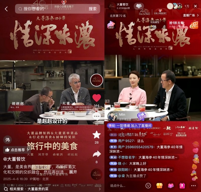 创始人大董表示,过去品牌注重口口相传,现在随着社会的不断变化,有文化内涵的老字号和品质餐厅通过抖音平台,让过去难以表达的场景变得更加形象,传播速度也大幅提升。大董相关负责人称,抖音帮助大董解决了高端客群触达不足的问题,周年庆直播通过文化内涵提升品牌溢价。品牌将坚持把大董“酥不腻”烤鸭5.0、董氏葱烧海参这些招牌菜做成经典。
