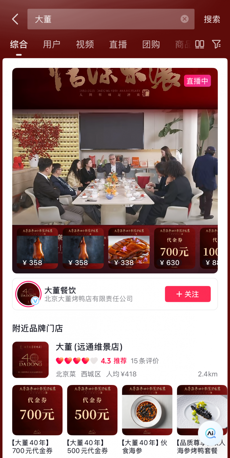 今年1月9日,大董入驻抖音生活服务平台。数据显示,截至4月28日,全国各城市门店陆续开启直播,直播间曝光超900万次。近双月,大董抖音搜索环比提升40%,支付环比增长85%。其中,新客下单占比超90%,环比增长165%。周年庆活动不仅让大董吸引了大量关注,还成功将流量转化为实际消费。