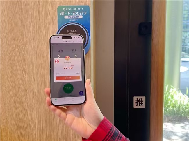 记者在Tims上海一家门店观察到,兼职咖啡师小李在下班时,拿着手机“碰一下”墙上的小蓝环,她当天兼职的上下班时间便清晰显示在手机屏幕上,工资直接转到了其零工账户。整个过程十分流畅,耗时不过数秒。