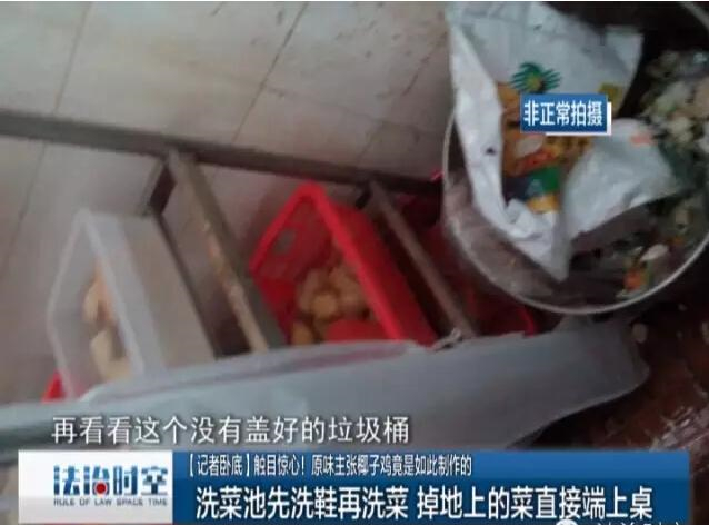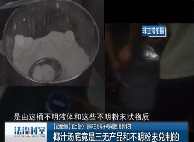 餐饮界报道 昨日,有记者暗访“原味主张椰子鸡”深圳益田高发城池店,发现其售卖的椰子鸡汤中其实并不含椰子汁,所谓的原味椰汁其实是由不明粉末状物质和三五产品勾兑而成。另外后厨食材的清理与制作过程均并未能达标,随处可见蟑螂,存在明显的脏乱差现象,还发现有配菜过期仍被继续售卖使用的情况。