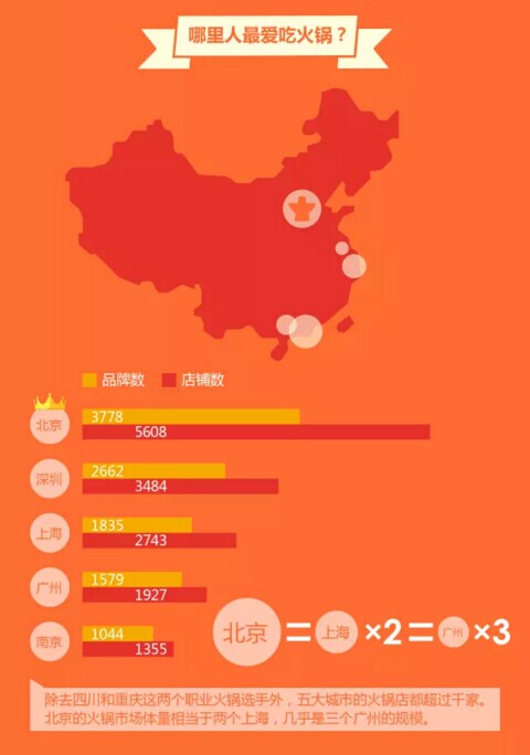 2015年底,方橙科技公布《数据库里的火锅业》。该报告选取北京、上海、广州、深圳、南京5座一二线城市作为数据分析对象,从区域上涵盖了华北、华南、华东3个部分,意在为用户反馈出火锅业在中国整体的发展现状。