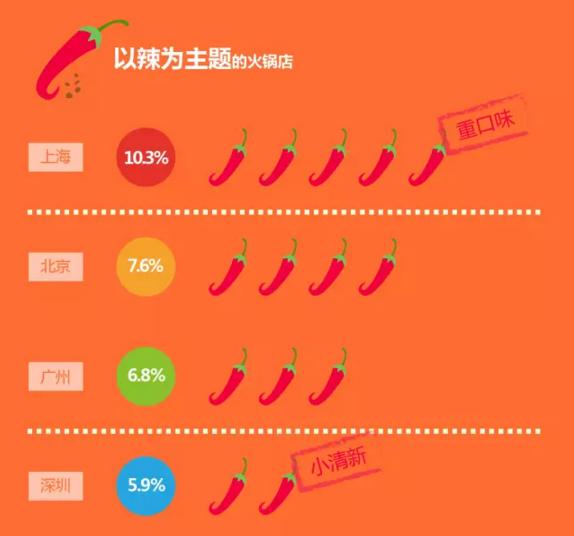 火锅大数据显示,在以辣为主题的火锅店中,上海再次脱颖而出,以超过10%的高比例,成为了5大城市中名副其实的重口味。而深圳则以5.9%的比例在这次评比中垫底,成为了无可厚非的“小清新”。