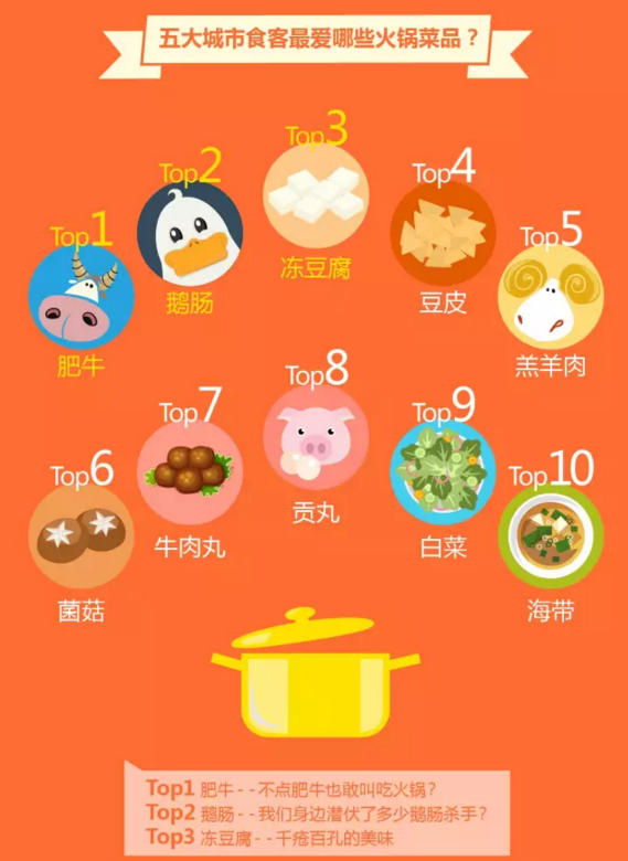 在火锅明星菜品的评比中,肥牛、鹅肠和冻豆腐占据了排行榜的前三名,而豆皮、羔羊肉、菌菇、牛肉丸、贡丸、白菜、海带则分列4到10位。