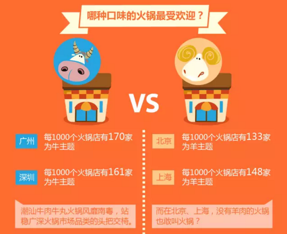 而按涮料的商品学分类,有羊肉、肥牛、鱼、鸡、菌类火锅等等。根据大数据显示,以牛羊主题的火锅在5大城市的火锅市场中引领风骚,占据了主流位置。