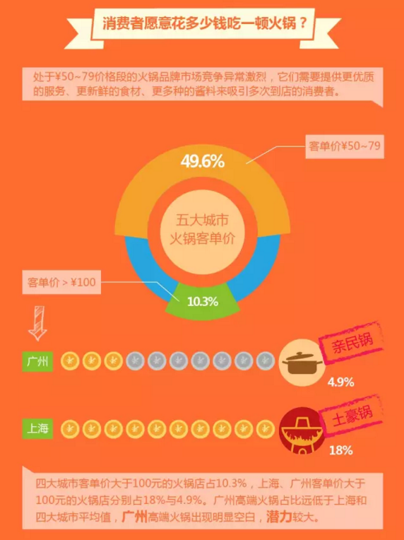 北上广深宁的火锅消费数据显示,但客单价方面,有接近50%的火锅店处在50元至79元的区段,在这个价位中市场竞争处在一个白热化的阶段,这意味着,想要争取到更多的用户,就必须为消费者提供更优质的服务、更新鲜的食材和更多元的体验和选择。
