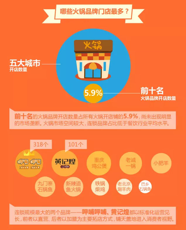在经营方式上,连锁规模最大的呷哺呷哺和黄记煌都以标准化、模块化的运营专长,分别以直营和加盟两种发展方向,快速的占据了高量的市场份额。