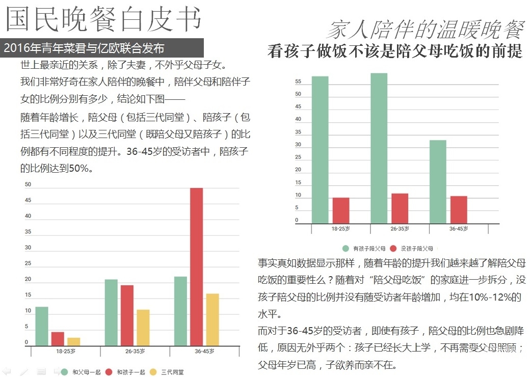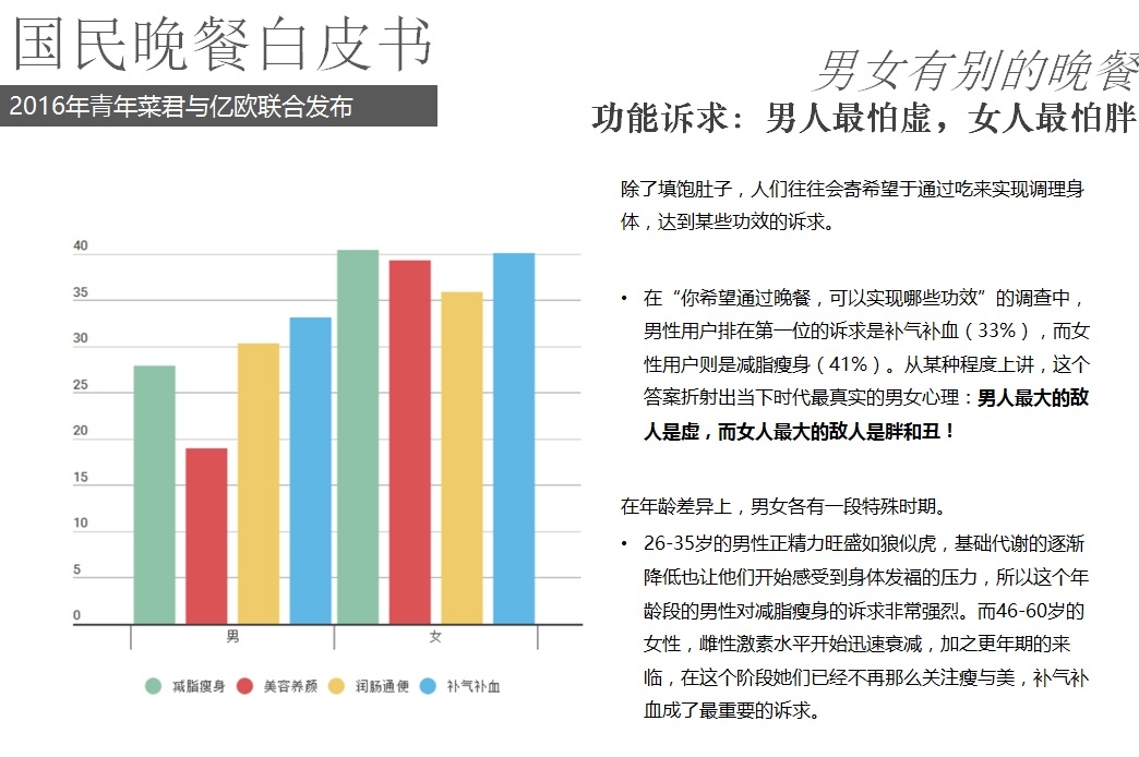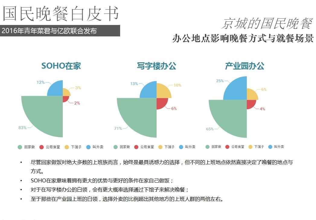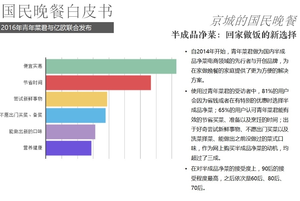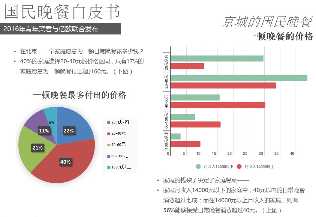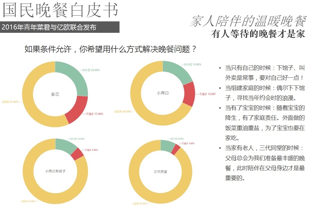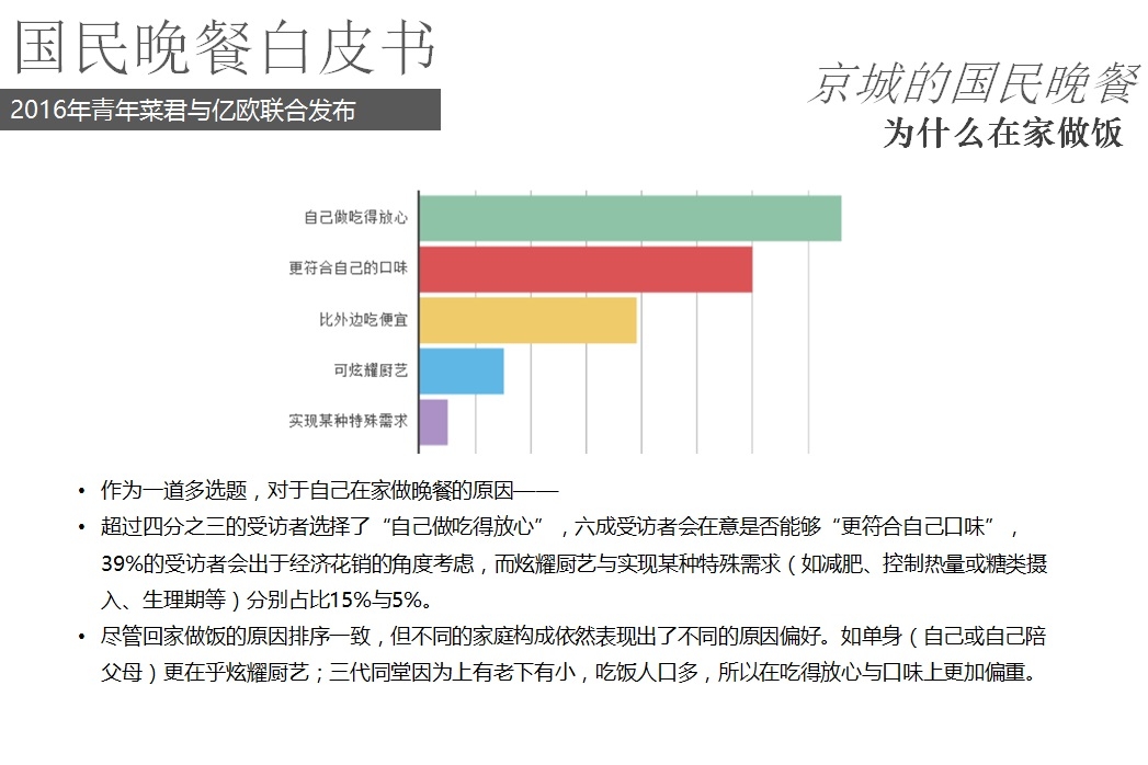 2016年5月18日,亿欧联合青年菜君发布北京国民晚餐数据白皮书,报告从晚餐种类、口味、价格、场所、诉求等角度进行用户分析,以5000份调查问卷数据为基础,反映国民的晚餐饮食习惯以及回家做饭和外卖的不同选择。