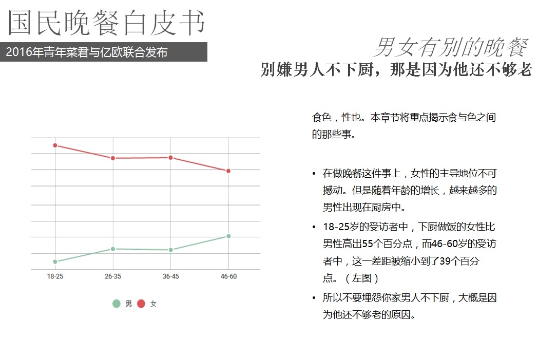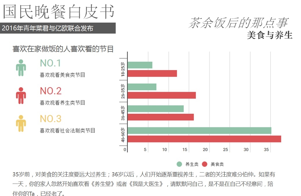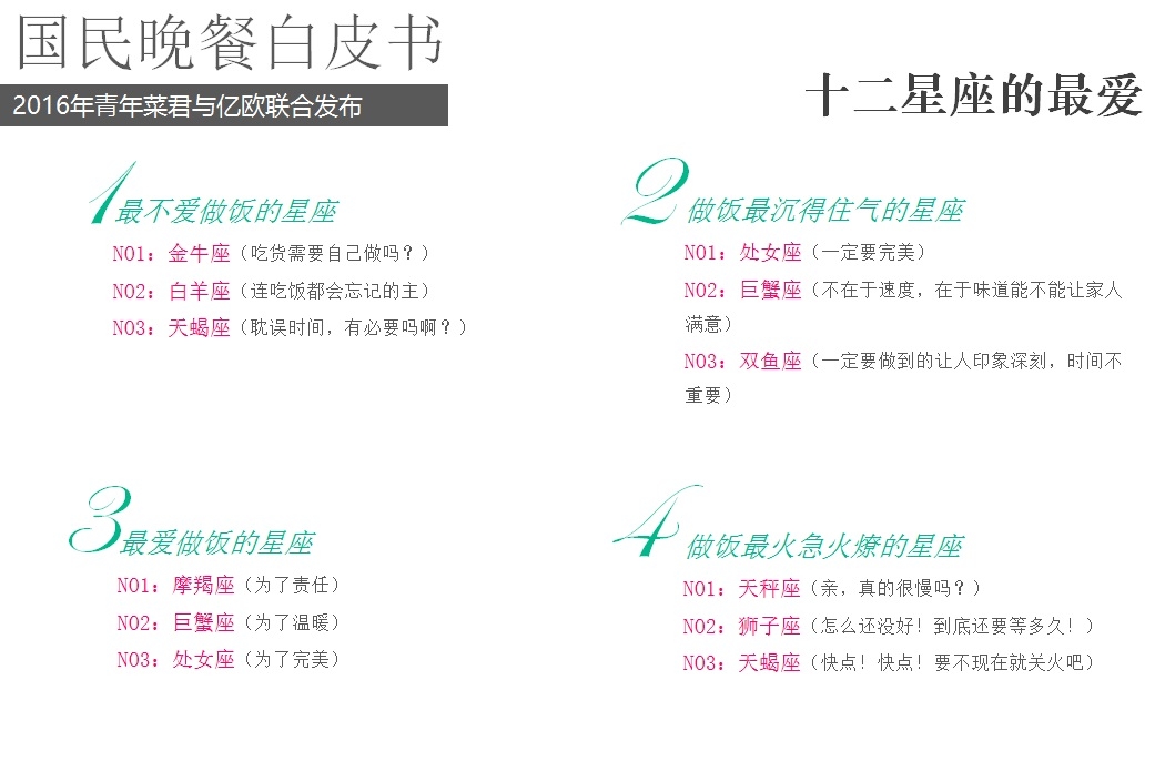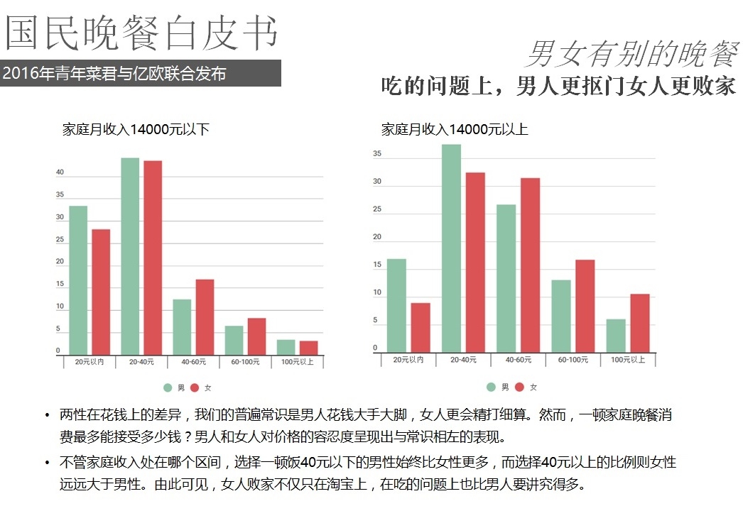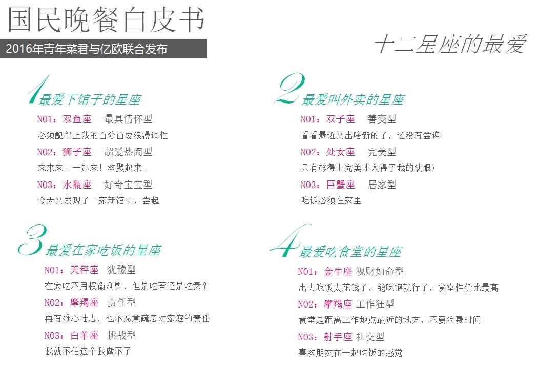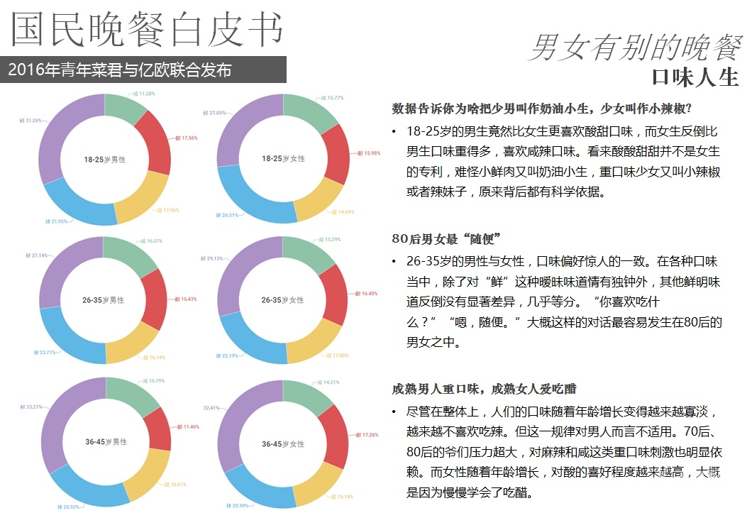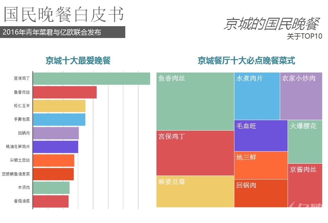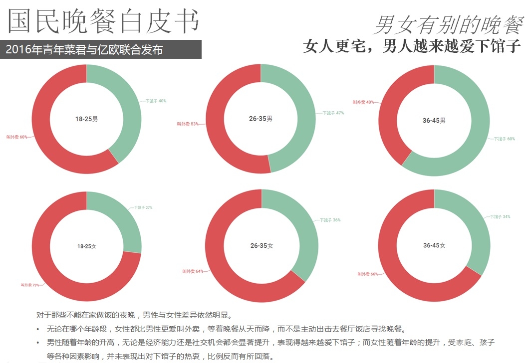2016年5月18日,亿欧联合青年菜君发布北京国民晚餐数据白皮书,报告从晚餐种类、口味、价格、场所、诉求等角度进行用户分析,以5000份调查问卷数据为基础,反映国民的晚餐饮食习惯以及回家做饭和外卖的不同选择。