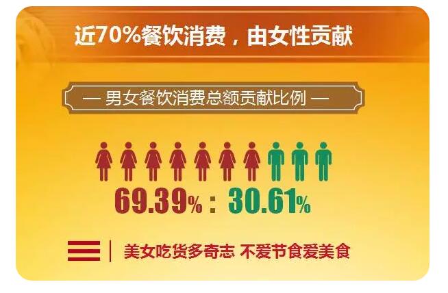 数据显示,男女餐饮消费比例为69.39%:30.61%,近70%的餐饮消费由女性贡献。