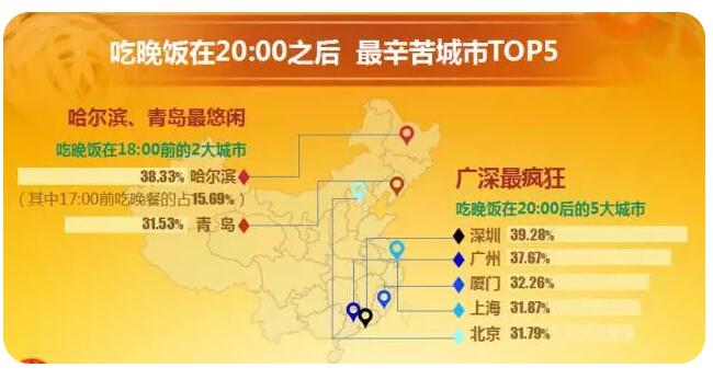 广深最疯狂:39.28%的深圳消费者晚饭时间在20:00之后,37.67%的广州消费者晚饭时间在20:00之后。