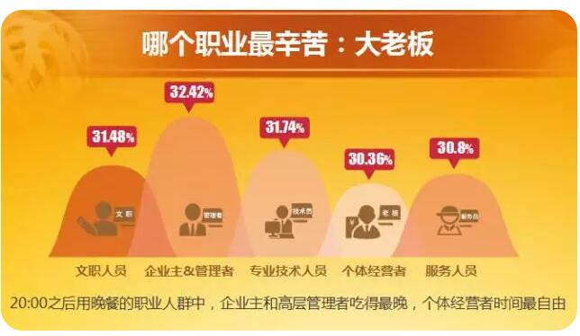 20:00之后用晚餐的职业人群中,企业主和高层管理者吃得最晚,个体经营者时间最自由。