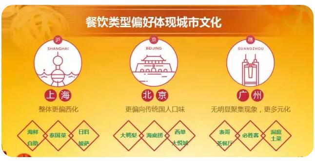 上海整体更偏西化;北京则是更加倾向于传统国人口味;广州没有明显的倾向,更加多元化。