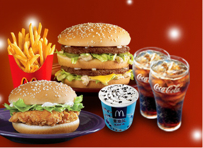 麦当劳柜台上方醒目的地方是几款套餐的大幅图片,一份巨无霸加一份薯条与一杯可乐就配成巨无霸套餐。