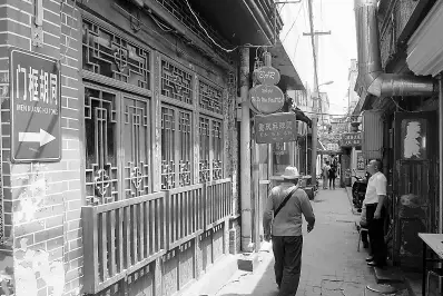 现在的游客慕名前往大栅栏,但很少有人特意去逛一逛门框胡同。老北京民谚有一句——“东四西单鼓楼前,王府井前门大栅栏,还有那小小门框胡同一线天”。如今,与修葺一新的大栅栏商业街相比,隐藏在繁华背后的门框胡同显得蹩脚了很多。“一线天”还在,但是屋檐上爬满了油烟落下的黑灰。常年没人打理的杂乱电线,把“一线天”分割成不规则的形状。
