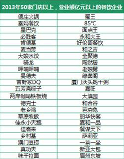 1、根据2014中国零售和餐饮连锁企业统计年鉴显示,2013年中国50家门店以上,营业额亿元以上的餐饮企业仅44家,上市企业仅9家(百花村、西安餐饮、福记食品服务、全聚德、小肥羊、湘鄂情、乡村基、唐宫中国、呷哺呷哺)。与国外餐饮巨头相比,规模程度仍较低。