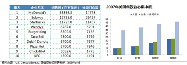 同时,根据美国统计局2007年的调查数据,美国餐饮各业态前50的企业营业额占比已经超过20%,其中休闲饮料(轻餐饮)的行业集中度最高,前4强、8强、20强和50强企业的行业营业额占比已经分别高达34.4%、28.4%、43.2%和46.5%。