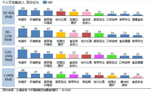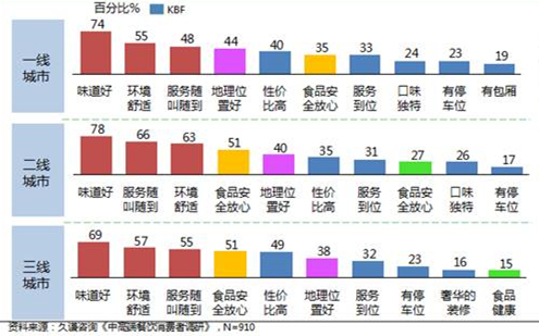 跨地域的消费者,除了口味大相径庭外,对于餐饮企业的需求基本一致:1、在各线城市,味道都是消费者选择餐厅时首要考虑的因素。2、一线城市的消费者更在意地理位置和价格,而二三线城市的消费者更在意食品安全问题。