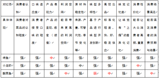 2、烤鱼、小龙虾、酸菜鱼三者的横向对比(强/中/弱)