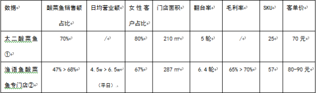 (注1:①②数据来源于品牌方;注2:渔语鱼门店数据,“﹥”符号连接的是变革前后的数据,如“4.5万﹥6.5万”指转型为酸菜鱼专门店后,日均营业额由4.5万提升至6.5万)