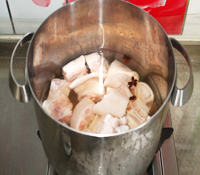 3、将猪脚捞出,再冲洗干净,放入煮锅中,倒入适量冷水,放入大料、1小勺料酒,加盖后大火煮开。