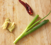 5、葱切长段、姜切大块后用刀背拍一下。