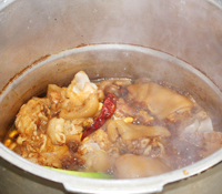 6、将煮过的猪脚捞出,用凉水冲洗至凉,放入高压锅中。再将泡好的黄豆捞出,冲洗干净后也放入高压锅中。再放入葱、姜、干红椒、山楂,加入适量水,水量约没过食材底部即可。点火,大火煮开。