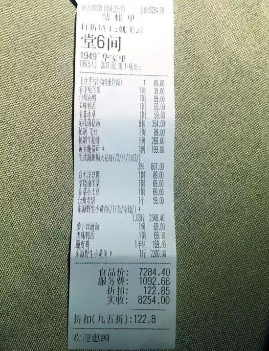 根据餐厅提供的消费清单显示,当晚李先生总共消费了8254元,其中包含两条重量为1.03斤和1斤的东海野生小黄鱼,两条鱼价格一共4628元。在消费清单中,还包含一项1092.66元的服务费,李先生认为这一服务费价格过高。