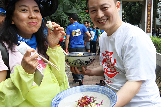 不少“驴友”纷纷为美食志愿者点赞,感谢其贴心付出。现场一位“驴友”笑着说,参与各种大小运动不下于10场,见过现场志愿者送水送面包的,但真的是第一次体验到吃“凉皮”的,而且还是这么一粗口大碗,这创意够新颖,关键这味道确实杠杠滴!