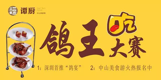 最后,需要提醒各位的是,中山美食游与鸽王大赛初赛的报名都已经在火爆进行中。想要参加中山美食游的顾客可以选择在各个谭厨分店的收银台处进行报名;而意欲免费参加鸽王大赛的顾客请注意以下报名时间与方式。